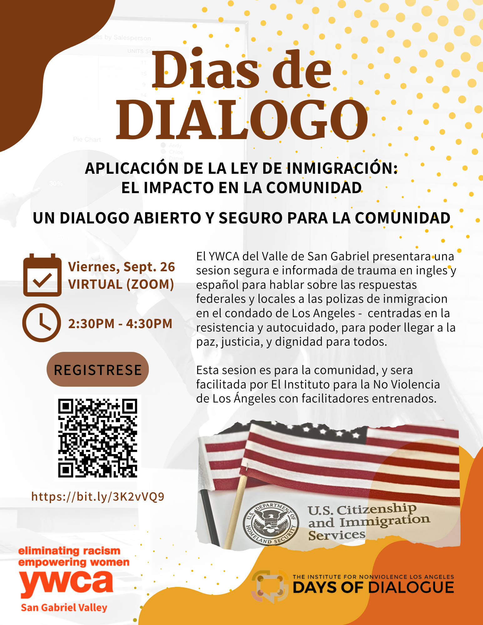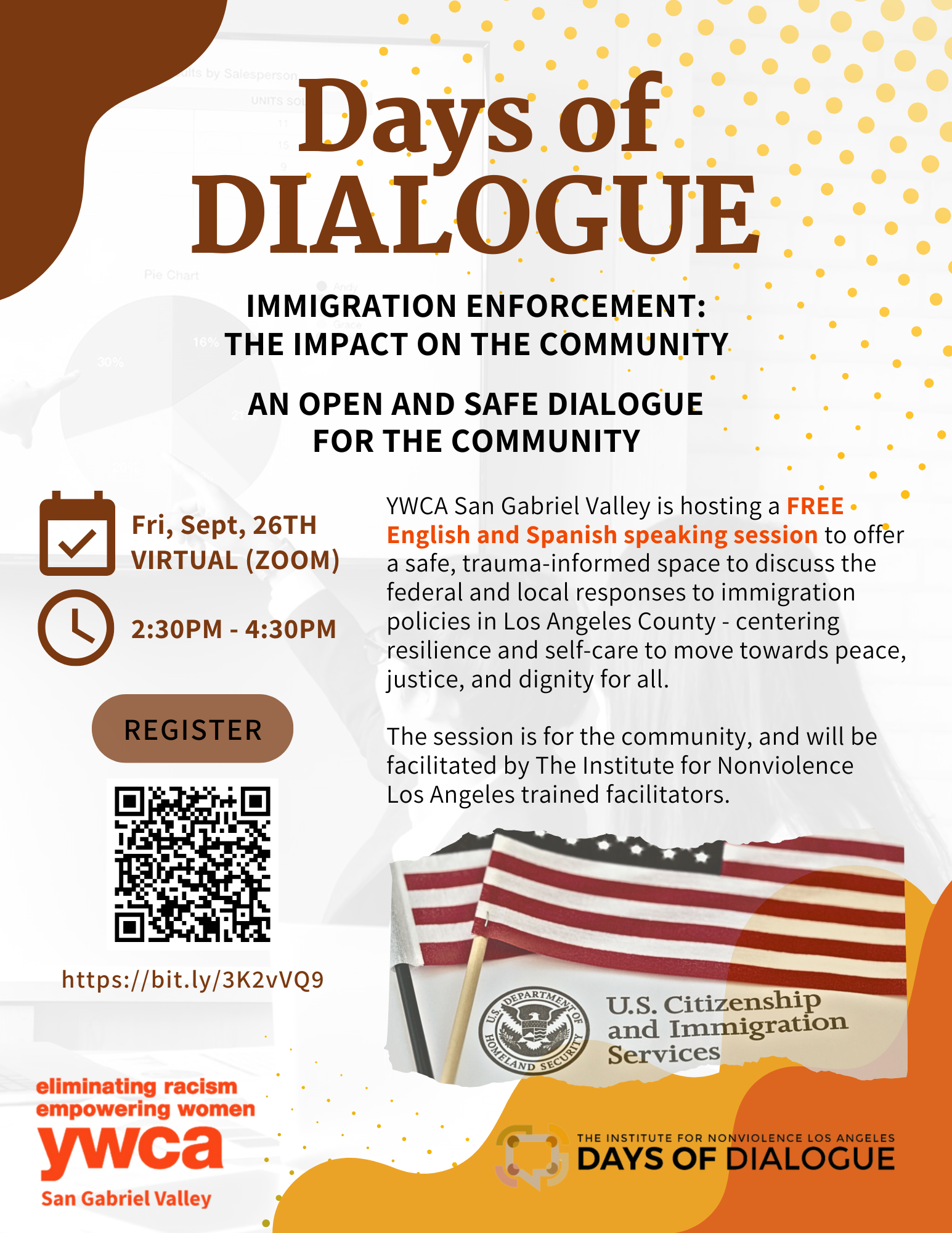 En colaboracion con El Instituto para la No Violencia de Los Ángeles, el YWCA del Valle de San Gabriel ofrecera una sesion gratis de Dia de Dialogo atravez de Zoom! La meta de esta sesion es proveer un espacio seguro e informado de trauma donde los miembros de la comunidad pueden compartir sus reacciones a polizas de inmigracion federales y locales en el condado de Los Angeles. Esperamos que puedan estar con nosotros para esta conversacion importante. Si tienen preguntas, por favor contactense con nosotros. Enlace: https://bit.ly/3K2vVQ9