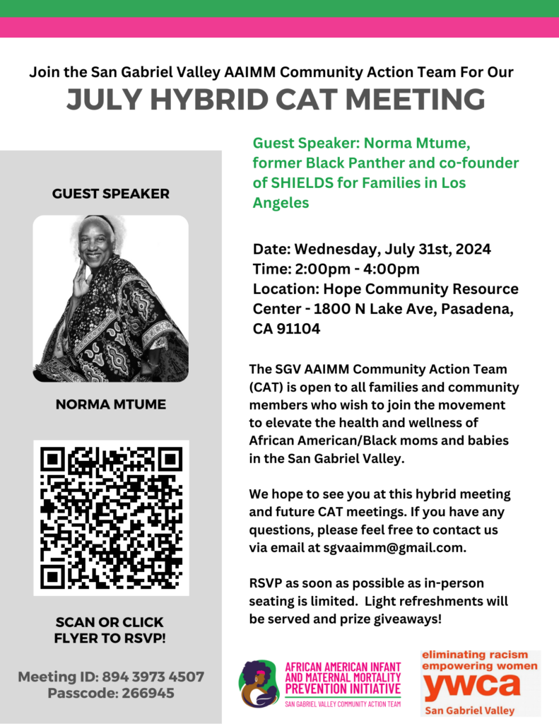 The SGV AAIMM Community Action Team (CAT) is open to all families and community members who wish to join the movement to elevate the health and wellness of African American/Black moms and babies in the San Gabriel Valley.
